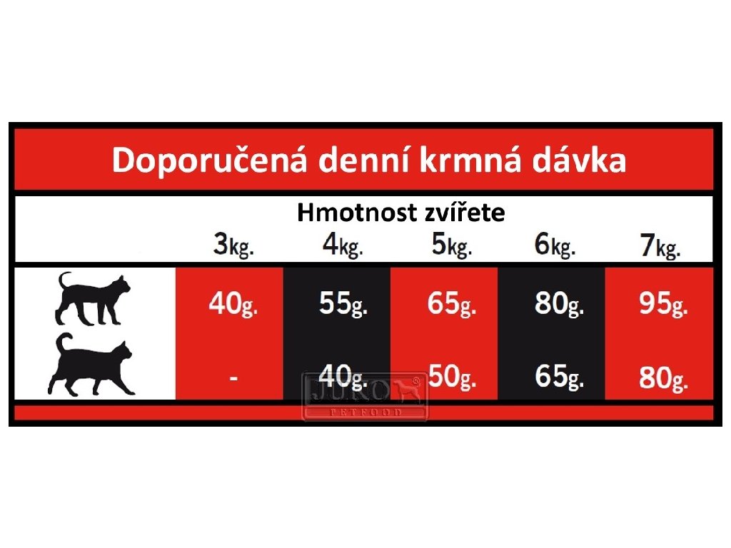 DOPLŇKOVÉ LÁTKY: Vitamín A 20.000 M.J./mg. Vitamín D3 1.600 M.J./mg. Vitamín E 750 mg/kg. Vitamín C 70 mg/kg. L-taurin 1.000 mg/kg, L-karnitin 75 mg/kg. DL-methionin 800 mg/kg. Železo (síran železnatý monohydrát) 198 mg/kg. Jód (jodid draselný) 3,5 mg/kg. Měď (síran mděďnatý pentahydrát) 10 mg/kg, Mangan (síran manganatý monohydrát) 10 mg/kg. Zinek (oxid zinečnatý) 155 mg/kg. Selen (seleničitan sodný) 0,27 mg/kg. Citrusové extrakty bohaté na bioflavonoidy 800 mg/kg. Etrakt z juky 170 mg/kg.