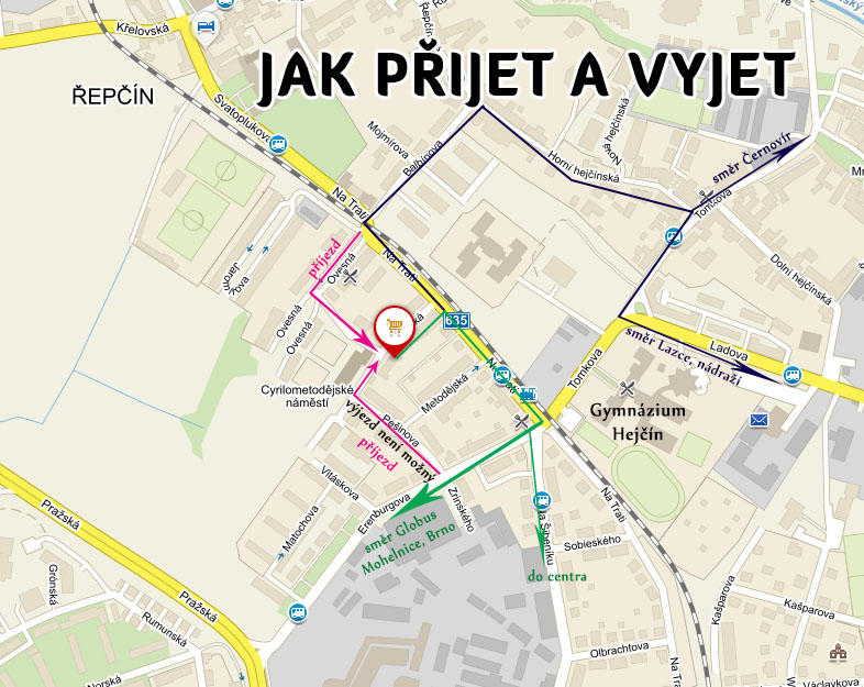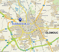 • autem ze směru Mohelnice (po "vedlejší" silnici): Pokud projedete obcí Křelov, pak po tom, co minete ceduli oznamující začátek Olomouce a přejedete přes vlakový přejezd, odbočíte doprava, dojedete k dalšímu přejezdu, který projedete rovně (tedy nikoli dále po hlavní silnici) do ulice Ovesná, pak doleva a přijedete ke kostelu - přímo před Vámi uvidíte naši výdejnu.