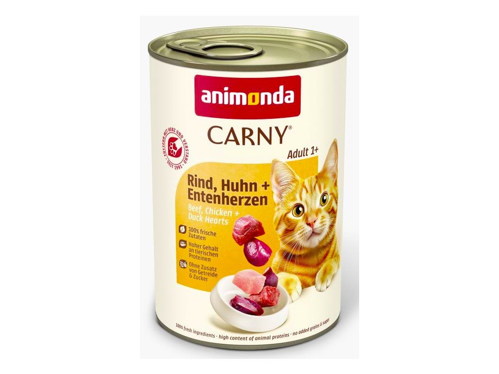 Carny Adult hovězí, kuře a kachní srdce - konzerva pro kočky 400 g + krém s lososem a kachnou ZDARMA