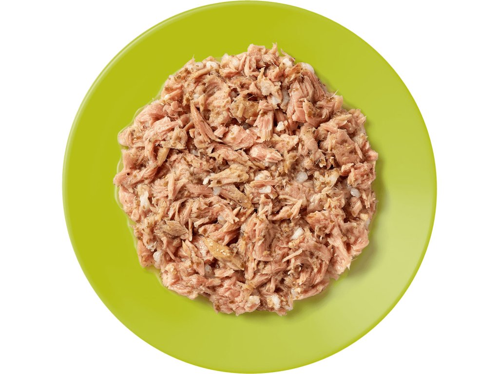 filet z tuňáka 70 %, rybí vývar, mořské řasy 5 %, rýže .