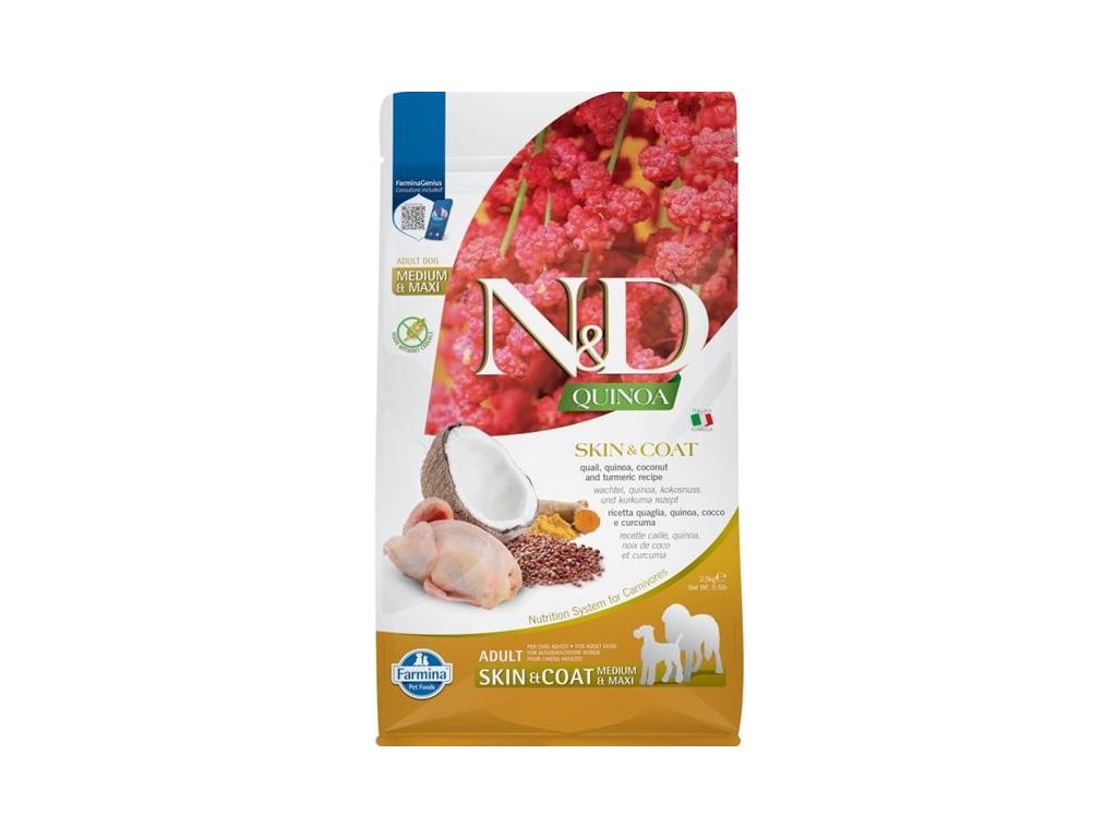 N&D Dog GF Quinoa Skin&Coat Medium Maxi křepelka kokos 7 kg + bezlepkové pamlsky v kyblíku ZDARMA