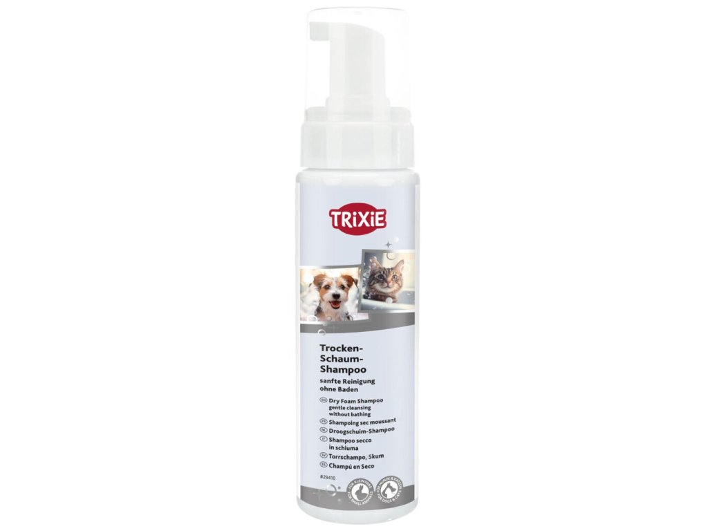 Suchá šamponová pěna s praktickým rozprašovačem, určená pro pravidelné čištění a údržbu zvířecí srsti, značka Trixie
