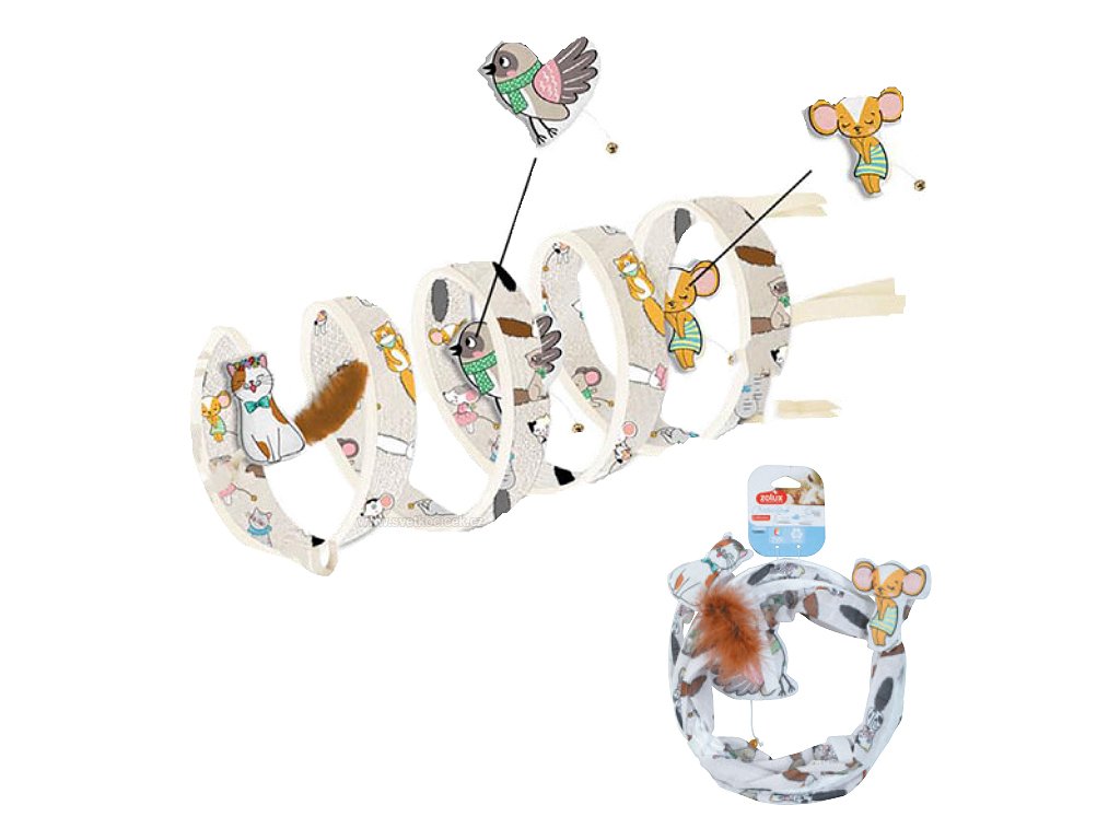 Součástí tunelu jsou všité hračky, které při pohybu kočky lákají k dalšímu hraní a podněcují lovecké instinkty. Mají všitou šustící fólii, proto kočičku ještě více rozdovádí.