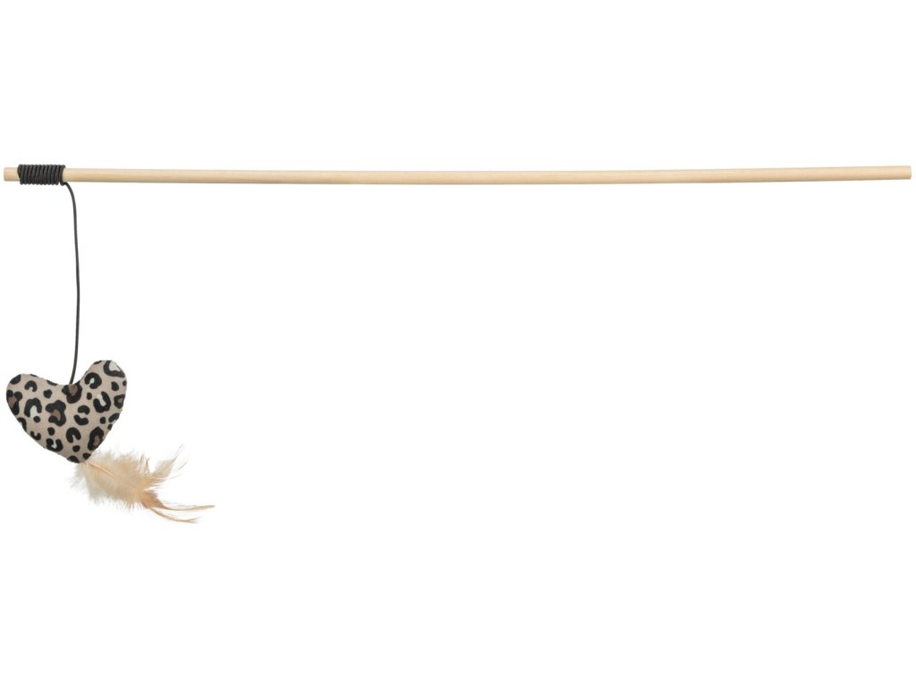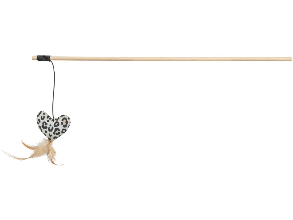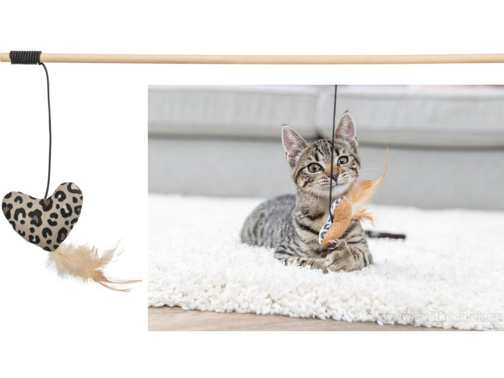 Hračka pro malé šelmičky - kočičky, plyšové srdíčko s leopardím vzorem, peříčky a rolničkou, ovoněné catnipem, připevněné na dřevěné udičce