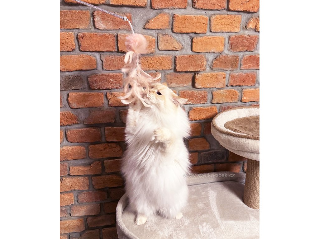 Z bambulky vede řetízek, na kterém jsou s odstupem umístěná peříčka. Ta kočičku úplně rozdovádí. Bude je chtít všechny ulovit!