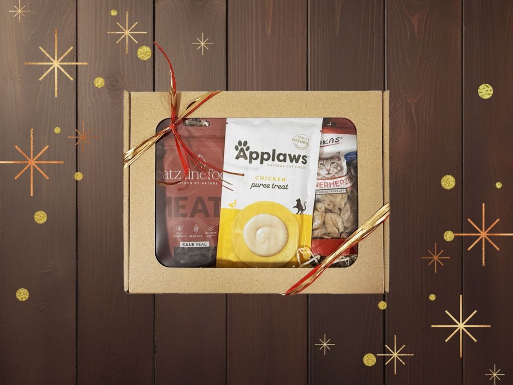 Nechejte balení dárků na nás! Vybrali jsme extra kvalitní pamlsky pro kočičky, ty jsme pro vás zabalili do krabičky a převázali mašličkou.