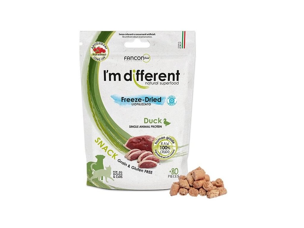 Analýza:bílkoviny 85 %, tuk 7 %, popeloviny 5 %, vláknina 0,1 %, vlhkost 5 %. - I'm different kachna 40 g - mrazem sušené pamlsky