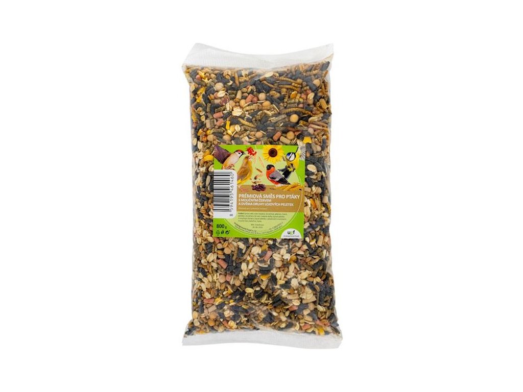 Složení: proso seté, oves loupaný, slunečnice, pšenice, hrách, peletky s moučným červem, ovesné vločky, lojové peletky s moučným červem, lojové peletky s jeřabinami a rozinkami, moučný červ, kukuřice, řepka.